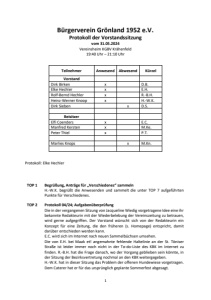 1 Bürgerverein Grönland 1952 e.V. Protokoll der Vorstandssitzung vom 31.05.2024 Vereinsheim KGBV Krähenfeld 19:40 Uhr – 21:10 Uhr Teilnehmer Anwesend Abwesend Kürzel Vorstand Dirk Birken x D.B. Elke Hechler x E.H. Rolf-Bernd Hechler x R.-B.H. Heinz-Werner Knoop x H.-W.K. Dirk Sieben x D.S. Beisitzer Elfi Coenders x E.C. Manfred Kersten x M.Ke. Peter Thiel x P.T. Marlies Knops x M.Kn. Protokoll: Elke Hechler TOP 1 Begrüßung, Anträge für „Verschiedenes“ sammeln H.-W.K. begrüßt die Anwesenden und sammelt die unter TOP 7 aufgeführten Punkte für Verschiedenes. TOP 2 Protokoll 04/24; Aufgabenüberprüfung Die in der vergangenen Sitzung von Jacqueline Wiedig vorgetragene Idee eine ihr bekannte Redakteurin mit der Wiederbelebung der Vereinszeitung zu betrauen, wird gerne aufgegriffen. Der Vorstand wünscht sich von der Redakteurin ein Konzept für eine Zeitung, die den früheren (s. Homepage) entspricht, damit darüber entschieden werden kann. E.C. wird sich im Internet nach neuen Sammelbüchsen umsehen. Die von E.H. bei Maak et! angemahnte fehlende Haltelinie an der St. Töniser Straße ist leider immer noch nicht in der To-do-Liste des KBK im Internet zu finden. R.-B.H. hat die Frage danach, wo der Vorgang geblieben sein könnte, in der Sitzung der Bezirksvertretung nochmal an den KBK weitergegeben. H.-W.K. hat in dieser Sitzung das Problem der offenen Hundewiese vorgetragen. Dem Caterer hat er für das ursprünglich geplante Sommerfest abgesagt.