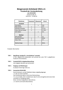 1 Bürgerverein Grönland 1952 e.V. Protokoll der Vorstandssitzung vom 20.06.2025 Holsteinstraße 10 19:45 Uhr – 21:00 Uhr Teilnehmer Anwesend Abwesend Kürzel Vorstand Dirk Birken x D.B. Elke Hechler x E.H. Rolf-Bernd Hechler x R.-B.H. Heinz-Werner Knoop x H.-W.K. Dirk Sieben x D.S. Beisitzer Elfi Coenders x E.C. Manfred Kersten x M.Ke. Peter Thiel x P.T. Marlies Knops x M.Kn. Protokoll: Elke Hechler TOP 1 Begrüßung, Anträge für „Verschiedenes“ sammeln H.-W.K. begrüßt die Anwesenden und sammelt die unter TOP 5 aufgeführten Punkte für Verschiedenes. TOP 2 Protokoll 05/25; Aufgabenüberprüfung Alle Aufgaben betrafen das Sommerfest. TOP 3 Eingänge und Mitteilungen Zu diesem Punkt liegt nichts vor. TOP 4 Sommerfest 28.06.2025 Die KG Grönland und die Pfadfinder haben endgültig abgesagt. J. K. (M.) ist nicht erreichbar. Vom Karateverein gibt es noch keine Rückmeldung. T. R. ist am 28.06. nicht in Krefeld kann aber für die vortragsfreie Zeit einen Stick mit Musik zur Verfügung stellen. M.Ke. wird das Fotografieren übernehmen. J. Ü. kommt und macht Glitzertattoos.