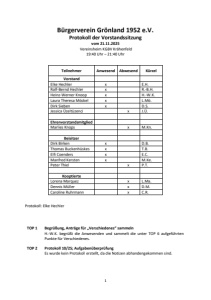 1 Bürgerverein Grönland 1952 e.V. Protokoll der Vorstandssitzung vom 21.11.2025 Vereinsheim KGBV Krähenfeld 19:40 Uhr – 21:40 Uhr Teilnehmer Anwesend Abwesend Kürzel Vorstand Elke Hechler x E.H. Rolf-Bernd Hechler x R.-B.H. Heinz-Werner Knoop x H.-W.K. Laura Theresa Möckel x L.Mö. Dirk Sieben x D.S. Jessica Üzeltüzenci x J.Ü. Ehrenvorstandsmitglied Marlies Knops x M.Kn. Beisitzer Dirk Birken x D.B. Thomas Buckenhüskes x T.B. Elfi Coenders x E.C. Manfred Kersten x M.Ke. Peter Thiel x P.T. Kooptierte Lorena Marquez x L.Ma. Dennis Müller x D.M. Caroline Ruhrmann x C.R. Protokoll: Elke Hechler TOP 1 Begrüßung, Anträge für „Verschiedenes“ sammeln H.-W.K. begrüßt die Anwesenden und sammelt die unter TOP 6 aufgeführten Punkte für Verschiedenes. TOP 2 Protokoll 10/25; Aufgabenüberprüfung Es wurde kein Protokoll erstellt, da die Notizen abhandengekommen sind.