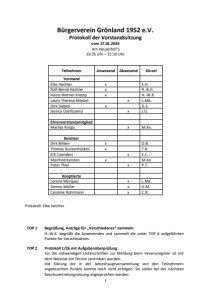 1 Bürgerverein Grönland 1952 e.V. Protokoll der Vorstandssitzung vom 27.02.2026 Am Hauserhof 5 19:35 Uhr – 21:10 Uhr Teilnehmer Anwesend Abwesend Kürzel Vorstand Elke Hechler x E.H. Rolf-Bernd Hechler x R.-B.H. Heinz-Werner Knoop x H.-W.K. Laura Theresa Möckel x L.Mö. Dirk Sieben x D.S. Jessica Üzeltüzenci x J.Ü. Ehrenvorstandsmitglied Marlies Knops x M.Kn. Beisitzer Dirk Birken x D.B. Thomas Buckenhüskes x T.B. Elfi Coenders x E.C. Manfred Kersten x M.Ke. Peter Thiel x P.T. Kooptierte Lorena Marquez x L.Ma. Dennis Müller x D.M. Caroline Ruhrmann x C.R. Protokoll: Elke Hechler TOP 1 Begrüßung, Anträge für „Verschiedenes“ sammeln H.-W.K. begrüßt die Anwesenden und sammelt die unter TOP 6 aufgeführten Punkte für Verschiedenes. TOP 2 Protokoll 1/26 mit Aufgabenüberprüfung Für die notwendigen Unterschriften zur Meldung beim Vereinsregister ist mit dem Notariat ein Termin vereinbart worden. Die Klärung der in der Jahreshauptversammlung von den Teilnehmern angebrachten Punkte konnte noch nicht erfolgen. Sie sollen bei der nächsten Bezirksvertretungssitzung angesprochen werden.