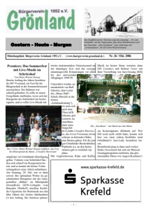 - 1 - Mitteilungsblatt Bürgerverein Grönland 1952 e.V. ( www.buergerverein-groenland.de ) Nr. 36 / Okt. 2006 Das Kopfbild auf der Titelseite zeigt das damalige „Tor zum Grönland“ mit der Litfasssäule, dem alten Pferdebrunnen und der Gaststätte „Zum Grönland“. Dort steht heute der „Grönlandstein“ der KG Grün-Weiß Grönland. Gestern - Heute - Morgen Premiere: Das Sommerfest mit Live-Musik im Schrörshof Von Heinz-Werner Knoop Bereits Anfang des Jahres beschloss der BV-Vorstand, ein Fest für die Bürgerschaft in der Sommerferienzeit auszurichten. Der Rahmen war schnell gefunden: Es sollte in einem Freigelände stattfinden, wozu sich der Biergarten des Schrörshof am besten eignete, und es sollte Live-Musik mit möglichst viel Grönländer Beteiligung geben. Volmers vom Schrörshof fan- den sich schnell zur Kooperation be- reit, und so konnte der kleine Vorbe- reitungskreis seine Arbeit aufnehmen. Am Samstag, 29. Juli, war es dann soweit: Bei optimalem Wetter im ge- schmückten Biergarten mit der trans- portablen „Bühne“ im Mittelpunkt (freundliche LKW-Leihgabe vom Benrader Obsthof!) machten Krefel- der Urgesteine der Beatmusik aus den 60er Jahren des letzten Jahrhunderts (!) den Anfang. Die Sunbeats präsen- tierten instrumentalen Gitarrensound aus der damaligen Zeit, und das erzeugte stimmungsvolle Erinnerungen vor allem bei den anwesenden Jahrgängen 1940-50. Unterstützt wurden sie musikalisch von Ralf Schertes, dem Leiter der „Music Hall“- Schule (Bericht in der letzten „Grönlandzeitung“), wo man sich auch zum Üben trifft. Schertes prä- sentierte im Anschluss dann seine Jungschü- ler-Combo Crossfire Hurrica- ne , die Cover-Versionen etwas seltener zu hörender Oldies zum Besten gaben. Für die jun- gen Grönländer Buckenhüskes, Peplinski u.a. an den Instru- menten gab es reichlich Ap- plaus. Mit vergleichsweise Ruhe und Kaffee- Musik im besten Sinne warteten dann Elfi Coenders und Helmut Vester mit ihrer Vorstellung von Jazz-Gesang (Elfi) zur Konzertgitarre (Helmut) auf. Wer Elfi noch nicht erlebt hatte, konnte sich hier von einer echten Krefelder (und Grönländer!) Jazz-Lady bezaubern las- sen. Bezaubernd ging es dann auch weiter: Heiko Grossmann hat sich ein Musical- Gesangsprogramm erarbeitet, das glei- chermaßen Ohren wie Augen (Kostüme!) Die „Sun Beats“ mit Musil aus den 60ern Der 1.Vors. Heinz-Werner Knoop eröffnete das Fest. Im Hintergrund die Band „Crossfire Hurricane“