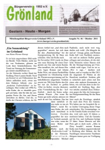 - 1 - Mitteilungsblatt Bürgerverein Grönland 1952 e.V. Ausgabe Nr. 46 / Oktober 2011 (www.buergerverein-groenland.de ) „ Ein Sonnenkönig“ im Grönland von Heinz-Werner Knoop Es ist kein ungewohntes Bild mehr im Bezirk: Viele Dächer, nicht nur die von Neubauten, glitzern im Licht ihrer Solarkollektoren. Der Trend zur Nutzung der Sonnenener- gie nimmt unaufhaltsam zu. An der Stirnseite rechter Hand der Siedlung Peter-Lauten-Straße Nord am Kreisel ist seit Frühsommer des Jahres außerdem noch, etwas aus dem Rahmen fallend, eine Art „moderner Fachwerksbau“ zu be- sichtigen. Hier wohnt seit 1996 Fa- milie Kuhn, die es ebenfalls gere- gelt satt hatte, Jahr für Jahr die stei- genden Preise für Gas und Strom entrichten zu dürfen. Und die, so durfte der Chronist erfahren, der für diesen Artikel nur „mal eben nach gegenüber“ musste, hat sich dann für den „Rundumschlag“ bei der Energienutzung für ihr Haus ent- schieden. Aber der Reihe nach. Im November 2010 wurde im Haus eine neue Heizung für einen Ener- giemix aus Gas und einem Kamin- ofen installiert, der, auf diesen Hin- weis legen Roman und Jolanta Kuhn Wert, mit einem Partikelfilter ausgerüstet ist. Gleichzeitig wurde die Warmwassergewinnung auf So- larkollektoren umgerüstet. Seitdem ersetzt ein 700-Liter-Boiler den frü- her nur ein Sechstel so großen 120er im Keller, zwecks ökonomi- scher Vorratshaltung für das – hof- fentlich - durch die Sonne aufge- wärmte Wasser. „Nur wenn die Sonne gar nicht scheint, müssen wir auch da mit Gas zufüttern. Das hat dann natürlich et- was mehr zu tun als früher“, meint Ro- man Kuhn, der sich auch manchmal in letzten Zweifeln gegenüber der neu- en Technik ausmalt, was wäre, wenn der neue Boiler mal ausliefe… Bliebe noch der „Fachwerks-Look“ an der Stirnseite. F o t o v o l t a i k - Spezialist Michael Peplinski, auch nicht weit weg, dachte sich wohl: „Da klingelst du mal an“. Gesagt, getan, und Roman Kuhn ließ vom Nachbarn ausmes- sen und an anderen Stellen genau erfragen und errechnen, ob die süd- liche Stirnseite seines Hauses sich für die Stromgewinnung per Foto- voltaik wohl eigne. Und sie tat es. „Wer A sagt…“ dachten sich Kuhns, und so wurden im Mai 2011 die insgesamt 42 Platten an der Hausfront installiert. Seitdem gibt es sicherlich auch schon mal den einen oder anderen Kommentar zu hören, wie sich das denn in das Ge- samtbild der Siedlung füge, aber wer möchte ernsthaft diese Diskus- sion gegen die Idee der konsequen- ten Energieumstellung für das Haus führen? Jetzt noch die Preisfrage, nämlich die nach dem Preis des Ganzen. Wir haben uns im Gespräch für ei- ne leichte Umwegung dieser Frage entschieden: Die Gesamtanlage, so ist für Familie Kuhn errechnet wor- den, wird sich nach 10 Jahren a- mortisiert haben. Und die Garantie auf die Ein- und Aufbauten beträgt 25 Jahre. Einen Hinweis auf den Preis gab es doch noch: „Alles in Zloty bezahlt“, meinte Roman Kuhn zum Schluss augenzwinkernd in Richtung alter Heimat, der für Nachfragen interessierter Nachbarn übrigens immer gern zur Verfügung steht.