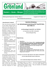 1 „Baustellenatlas Grönland“ Jeder, der sich auch nur irgendwie auf den Straßen Grönlands bewegt, egal ob mit Auto, Fahrrad oder zu Fuß, kann Sie nicht übersehen oder auch ignorieren, die Anhäufung von Baustellen in unserem Viertel. Die Erneuerung von Rohren, Leitungen und Kabeln im Untergrund wirken sich zukünftig positiv auf das grön- ländische Leben aus: • Schnelleres Internet mit mehr Datenvolumen • Schnelleres Abführen von Starkregen und damit geringere Gefahr für Kellerüberschwem- mungen • Qualitätssicherung der Frisch- wasserzufuhr • Schutz des Grundwassers durch Erneuerung maroder Abwass- ersammelleitungen • Gefahrenabwehr durch War- tung oder Erneuerung von Gas- leitungen Im hier und heute sieht die Bilanz an der Oberfläche nicht ganz so gut aus. Verkehrsströme werden durch Re- duzierung von Fahrspuren verlang- samt oder durch Sperrungen in sonst ruhigere Bereiche umgelenkt. Gleichzeitig gehen hierbei Park- plätze verloren oder sind Garagen nicht mehr erreichbar. Das liebe Blech muß dann zwangsweise an anderer Stelle geparkt werden, wo es dann zu einem erhöhten Wettbewerb um die verbliebenen Plätze kommt. Fahrrad- fahrer irritieren Autofahrer zu tiefst, wenn Sie bei Wegfall des Fahrradwe- ges auf der Straße auftauchen. Der Weg zum Einkaufen, der abendliche Mitteilungsblatt Bürgerverein Grönland 1952 e.V. Ausgabe Nr.57 Frühjahr 2017 (www.buergerverein-groenland.de ) Gestern – Heute – Morgen Das Kopfbild auf der Titelseite zeigt das damalige „Tor zum Grönland“ mit der Litfa sssäule, dem alten Pferdebrunnen und der Gaststätte „Zum Grönland“. Dort steht heute der „Grön- landstein“ der KG Grün -Weiß Grönland. Herzliche Einladung zur Jahreshauptversammlung 2017 des BV Grön- land 1952 e.V. am Donnerstag, 06. April 2017, um 19:30 Uhr i m Vereinsheim des KGBV „Krähenfeld“ Edmund-Bungartz-Weg Tagesordnung: 1. Begrüßung 2. Gastreferat Herr Oliver Heising, SWK: „ Vorstellung der aktu- ell und demnächst anstehenden Bauplanungen der SWK in unserem Stadtbezirk “, mit Gelegenheit zu Nachfragen 3. Vorstands- und Kassenbericht für das Vereinsjahr 2016 4. Bericht der Kassenprüfer 5. Entlastung des Vorstands 6. Neuwahl eines/r Kassenprüfer/in 7. Anfragen und Anregungen aus der Bürgerschaft; erste Infor- mationen über Vorstandsberatungen zum Thema „Quo vadis, Bürgerver ein Grönland?“ Wir freuen uns auf Ihren regen Besuch! Alle weiteren Interessierten sind als Gäste ebenfalls herzlich willkommen. Der Vorstand des Bürgervereins Grönland 1952 e.V. (gez.) Heinz-Werner Knoop, Vors. (gez.) Dr. Rolf-Bernd Hechler, stellv. Vors.